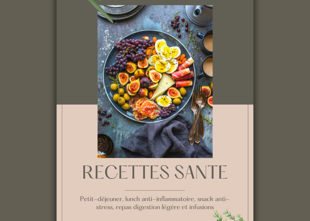 Recueil de 20 recettes — petit-déjeuner, repas anti-inflammatoires, snacks anti-stress, dîners légers pour la digestion et infusions — élaborées avec des ingrédients reconnus pour leurs bienfaits sur la santé.